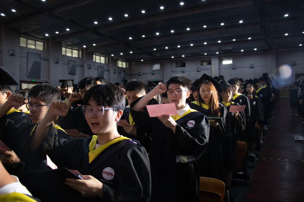 仪式最后,由2023年校长奖获得者董磊同学领誓毕业宣言,全体毕业生共同起誓,用一句句铿锵有力的青春担当,一声声奋勇前行的时代强音唱响了斛兵塘畔最美的盛夏弦歌。