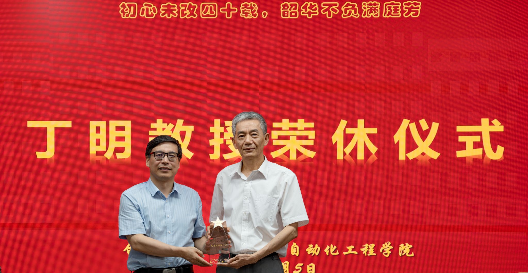 图7 副校长丁立健给丁明教授颁发从教四十年水晶纪念杯