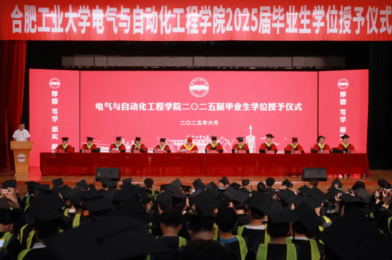 2025届毕业生学位授予决定》。学院学术委员会副主任李贺龙教授作为教师代表发言。安徽省优秀毕业生谭涛作为学生代表发言。智能电网信息工程专业万欣霖母亲代表毕业生家长发言。仪式由学院党委副书记兼纪委书记张栋主持。
