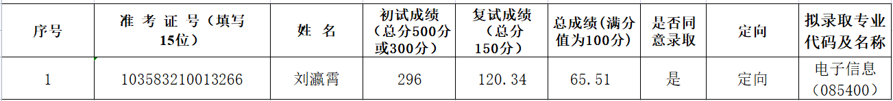 各位考生: 非全日制硕士研究生第一次调剂拟录取已公示名单中电子信息专业有1名同学放弃拟录取资格,现按总成绩由高到低依次递补录取非全日制电子信息专业考生1名,递补拟录取考生情况公示如下: