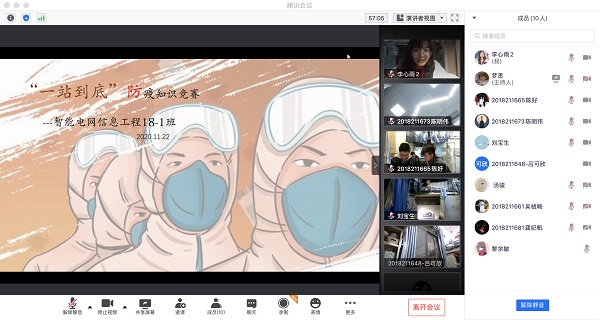 1115日晚,智能电网信息工程18-1班团支部开展线上防疫知识理论学习,通过线上直播疫情防控知识、观看《学校疫情防控专家报告视频会》、《这就是中国(全球抗疫中的中国担当)》。不仅从科学角度让同学们了解新型冠状病毒的来源、传播途径和防疫手段,更让同学们在这场战“疫”中,汲取民族精粹的养份,塑造积极健康的人格。理论学习中出现的防疫知识作为下一阶段一站到底竞赛的题目来源。1122日晚,智能电网信息工程18-1班全体同学以寝室为单位,参与线上“防疫小知识”一站到底竞赛。11组队伍经过初赛、半决赛和决赛的激烈角逐,最终以抢答赛的形式决出胜负。