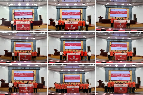 实践团学生代表吕双杰宣读《2023年暑期“三下乡”社会实践活动安全承诺书》,全体成员将安全意识深深烙刻进坚毅的笔迹里。与会老师为立项团队授旗,各团队成员将青年担当镌刻在光影的誓言里。