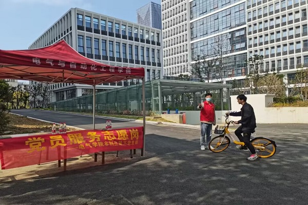 在逸夫楼周围设置“党员志愿服务岗”,开展“文明校园行,车辆按规停”疫情防控志愿服务活动。