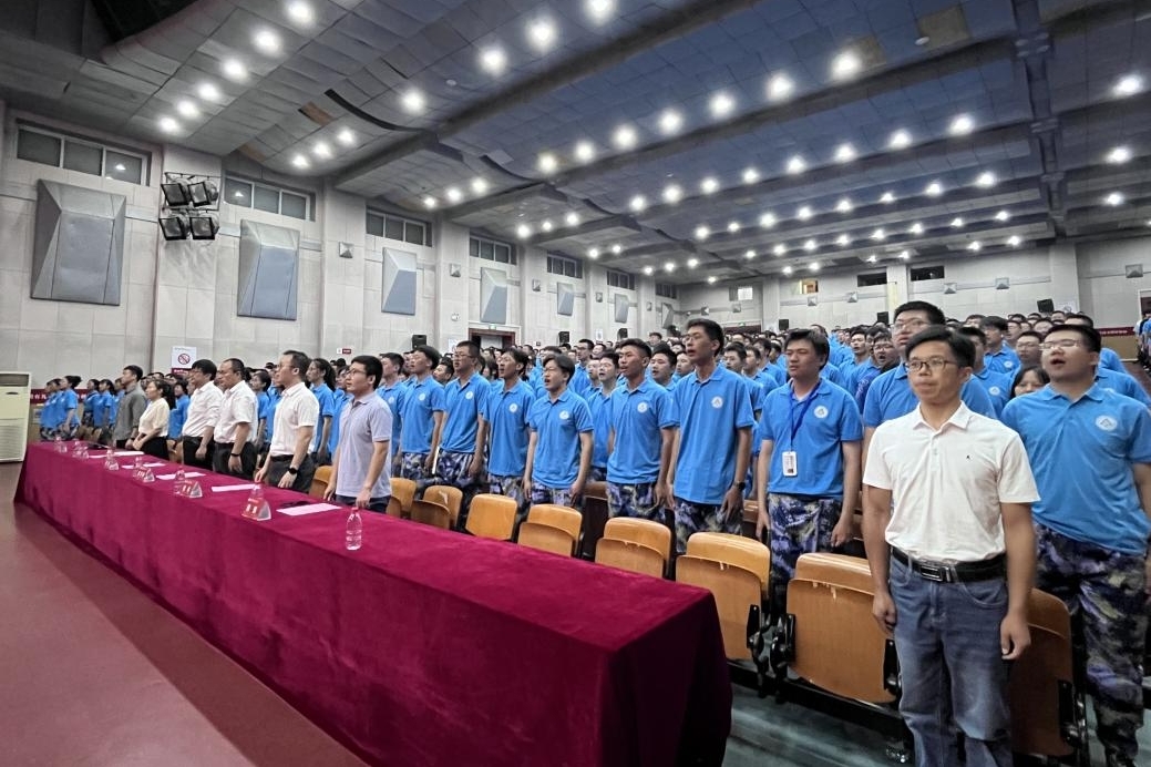 院徽在蓝色人海的映衬下熠熠生辉。傍晚19时,活动正式开始,全体起立,奏唱国歌。