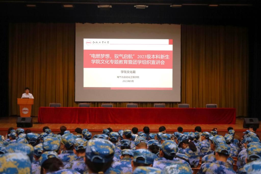 “电燃梦想,驭气启航”2023级本科新生学院文化专题教育暨团学组织宣讲会在斛兵礼堂召开,2023级本科新生辅导员、学生团学组织相关负责人、全体新生参与本次活动。