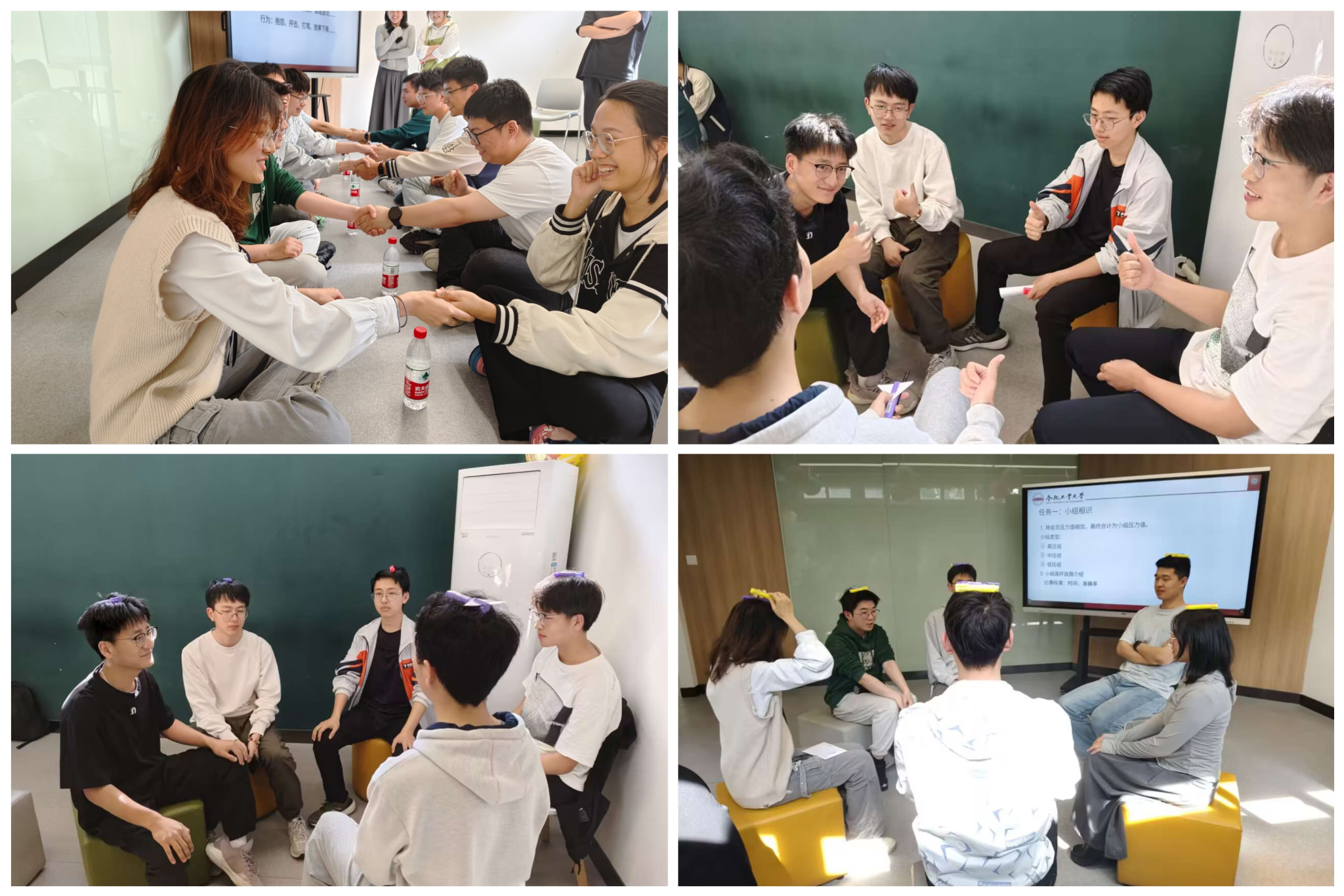 接着,三组同学通过“过电”游戏、眼疾手快游戏以及青蛙跳游戏进行团体比拼,在游戏中,小组成员间沟通合作,商讨策略,完成游戏。现场气氛活跃,同学们在游戏中逐渐放松了心情,放下拘谨和防备,增强彼此的理解和信任,为后续的心理疏导环节奠定了良好的基础。