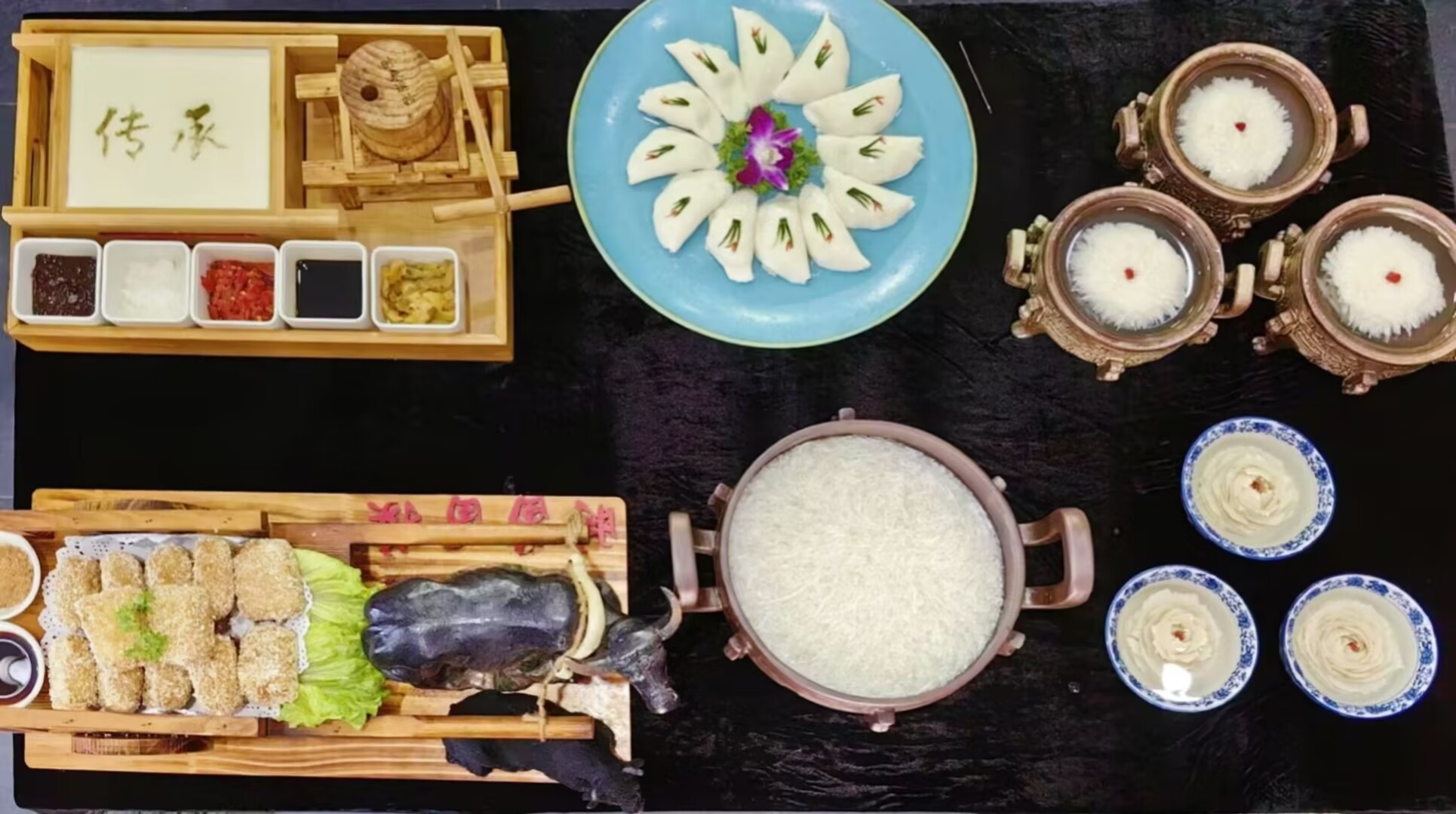 团队还采访了非遗豆腐宴传承人张士宏,并现场观赏学习豆腐宴的制作。张师傅做了近四十年的豆腐宴,在此期间独创了一百多道豆腐菜品,先后被央视新闻、江淮日报等媒体报道,其中“刘安点丹”、“淝水之战”和“楚鼎生香”等历史事迹,纷纷被他用豆腐菜的形式呈现出来,创新性地将非遗豆腐宴与寿县文化相结合,在传承豆腐宴的同时,助推了当地旅游业的发展。“我只是一个普通的农户,既然肩负了传承非遗的重任,就要想尽一切办法把豆腐宴做好、做精。”张士宏坚定地说,“要对得起自己的良心,对得起顾客的期望,对得起国家的支持”。成员们听了张师傅的话,敬佩之意油然而生。