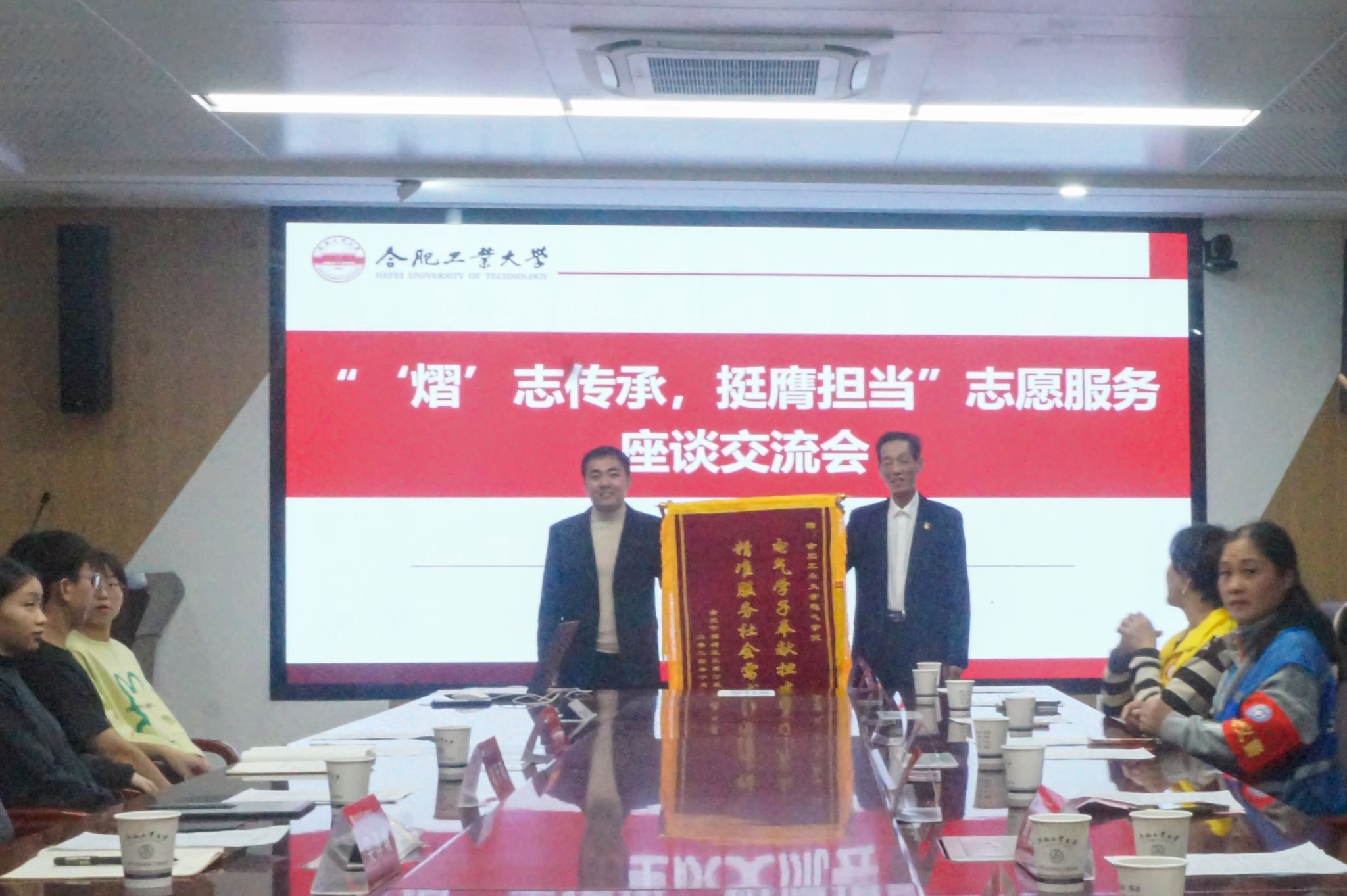 刘开阳对瑶海区乐善公益服务中心志愿者来学院交流表示热烈欢迎,对双方前期开展的志愿服务活动表示充分认可,她介绍了学院志愿服务工作的理念思路、特色品牌、实施成效,学院聚焦“党建带团建,志愿强志向”工作思路,构建学生党支部与基层社区一对一“结对+接力”长效模式,打造“巷约青春,‘熠’启守望”志愿服务品牌,开展丰富多彩的志愿服务活动。希望双方在前期合作基础上加强志愿服务交流合作,为青年学子奉献社会、投身基层搭建广阔平台。乐善公益服务中心丁瑞介绍了双方前期合作开展的志愿服务工作,对服务过程中表现优异的志愿者给予了充分肯定,并为他们制作优秀志愿者荣誉证书,乐善公益服务中心理事长陈余文、合肥市最美志愿者王松芬和刘开阳老师共同为表现优异的志愿者颁发荣誉证书,陈余文代表乐善公益服务中心向学院赠送锦旗,对电气学子参与社区治理,服务社会所需表示充分认可。