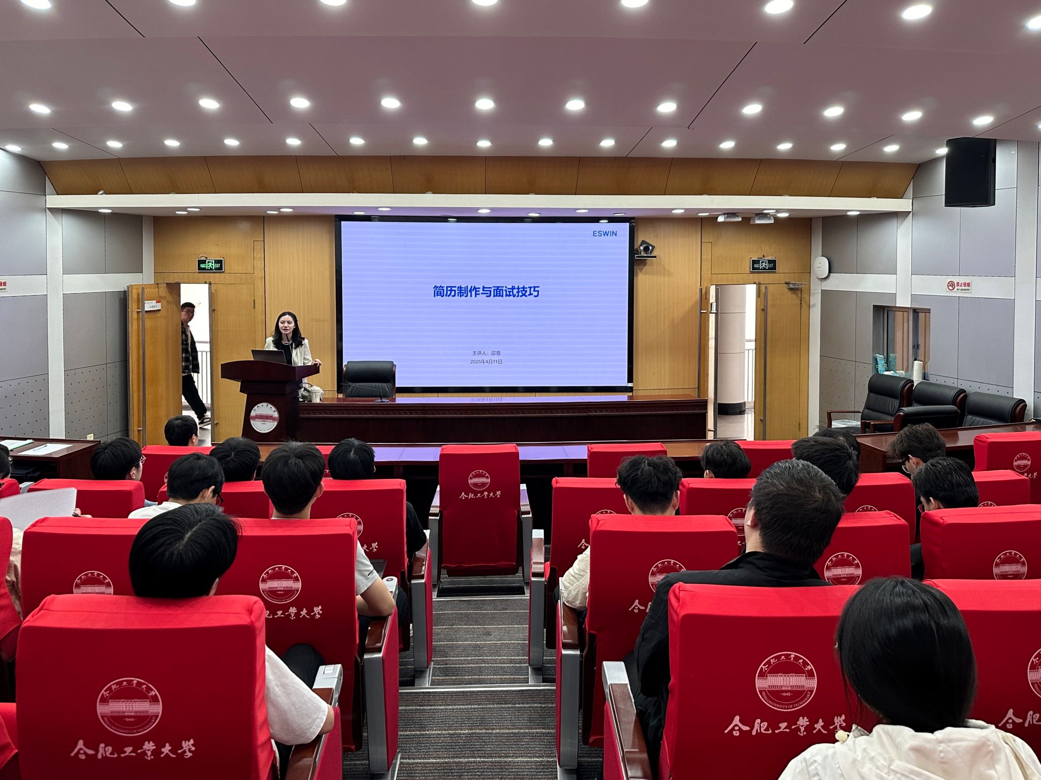 在屯溪路校区学术会议中心二楼小报告厅开展“熠志启航,职引未来”简历制作与面试技巧培训会,北京奕斯伟计算技术股份有限公司全国校园招聘负责人邵意主讲,学院80余名学生参与。