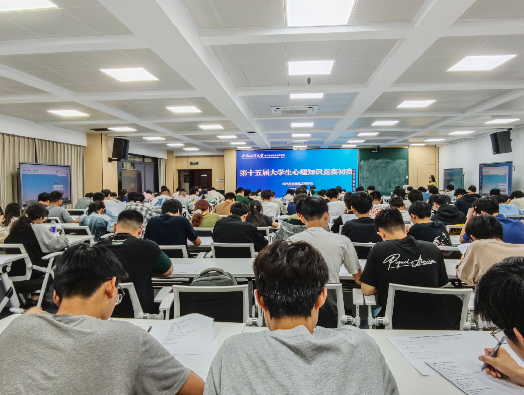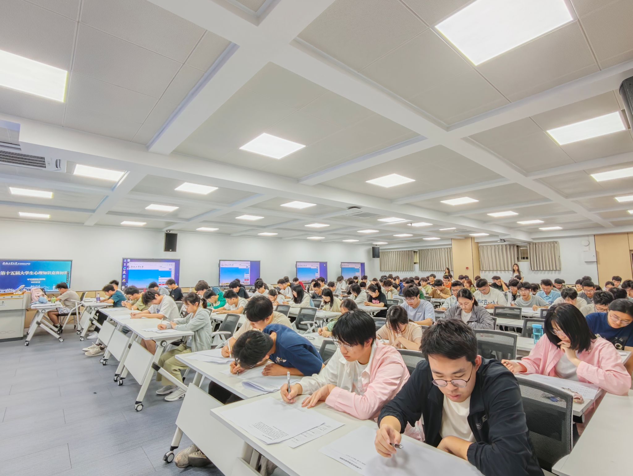 于逸夫楼1005教室举行第十五届大学生心理知识竞赛初赛,百余名学生参与比赛。