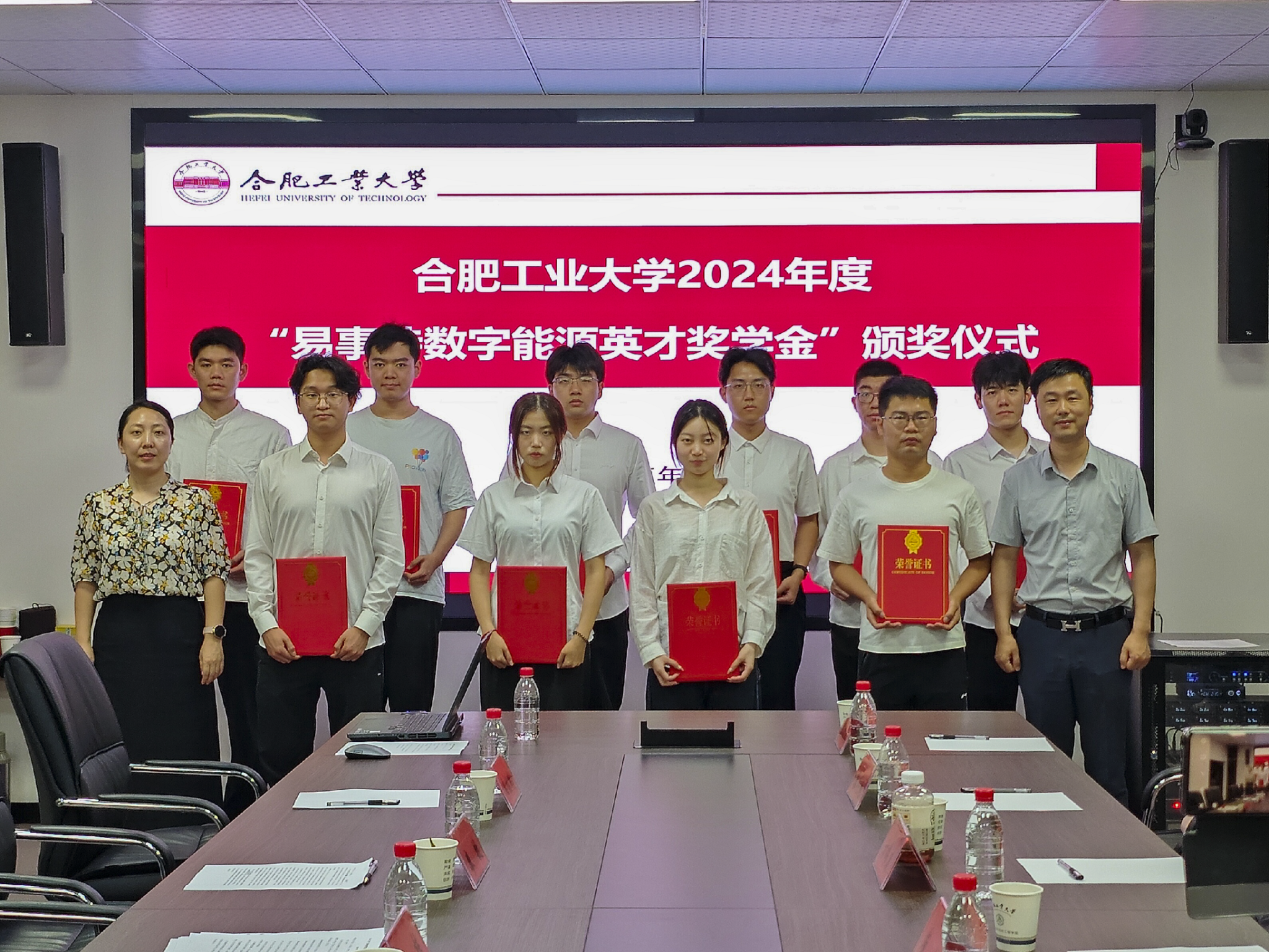 关于表彰2024年度“易事特数字能源英才奖学金”获得者的决定》。2021级本科生廖敏代表获奖学生发言。与会领导老师为10名获奖学生颁奖并合影留念。