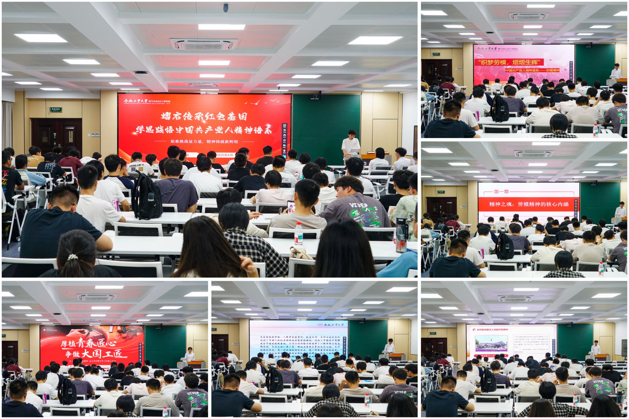 学院“熠启传承红色基因,学思践悟中国共产党人精神谱系”宣讲团成员张家辉、徐薇、李雅楠、任岩、李帅、李任静围绕劳动精神、工匠精神、太行精神、劳模精神、抗震救灾精神、改革开放精神展开宣讲。成员们以图述史、以事说理,用青年视角传递信仰力量,通过列举港珠澳大桥建设、“南网工匠”李辉、“七一勋章”获得者艾爱国、合工大研究生支教团等真实鲜活的故事,引导同学们深刻理解红色精神的历史渊源与时代价值。