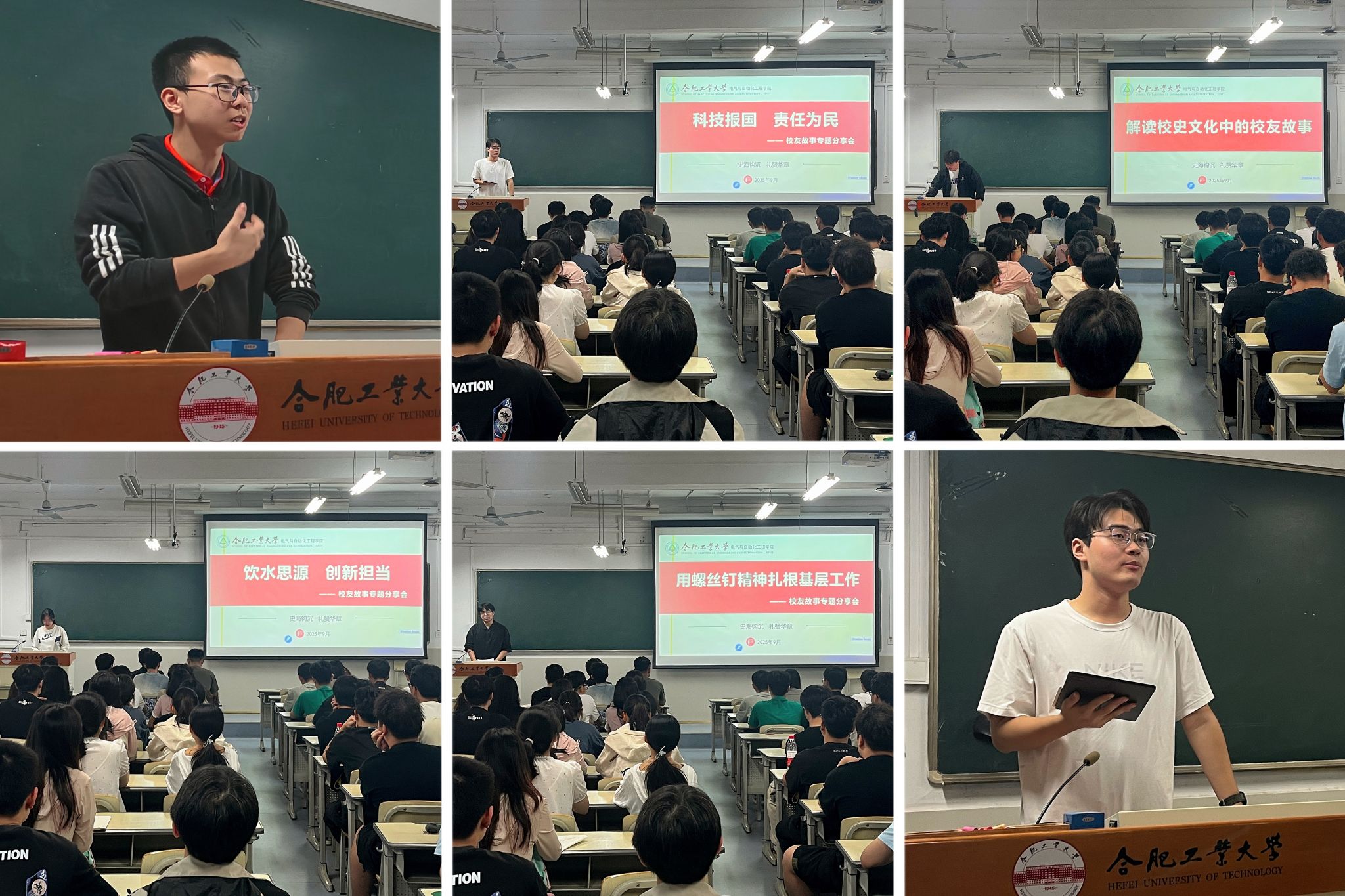 学生代表围绕学校八十载发展历程、优秀校友人物、校园文化等内容进行发言分享,并表达了对校庆日即将来临的浓烈期盼。葛子诚以校史馆与屯溪路校区二号南楼学生公寓文化长廊为主题,分享了生活中的沉浸式校史学习体验。王张璟通过讲述获得社会捐资奖学金的故事,分享了对优秀校友设立奖助学金反哺学校的感激之情。王鹏陈结合自身在校发展联络处担任学生工作助理的经历,介绍了曹仁贤、朱庆龙等杰出校友的典型事迹。蒋知好讲述了通过“双碳青年名企行”系列活动,实地参观一天电气、科大智能等校友企业的收获体会。吕志成结合前期组建校史文化读书小组的经历,对学校历史沿革、校区变迁等故事进行了分享。