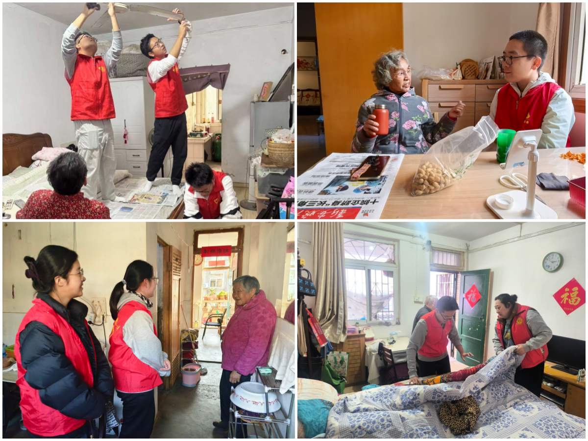 在曙光社区,志愿者分赴各站点,为老人测血压、清杂物、协助养老认证,同步完成社区租房信息统计;随后,排查电动车违规停放等隐患,入户探望独居老人、整理床铺,协助核查住户资料;此外,还携带日用品走访老人,叮嘱保暖安全,助力社区公共事务,清理环境、规整车辆,全方位筑牢服务屏障。在龚湾社区,志愿者聚焦情感陪伴,探访高龄老人,询问身体与生活状况,倾听人生经历与城市情怀,闲谈家常,分享校园趣事,在温馨氛围中为老人驱散孤独。在琥珀街道社区养老服务中心,志愿者们手把手教老人使用智能手机、讲解冬季养生知识并演示按摩手法,入户为独居老人做家务、促膝长谈,为行动不便老人代购代办,以实际帮助与心灵慰藉,让敬老美德落地生根。