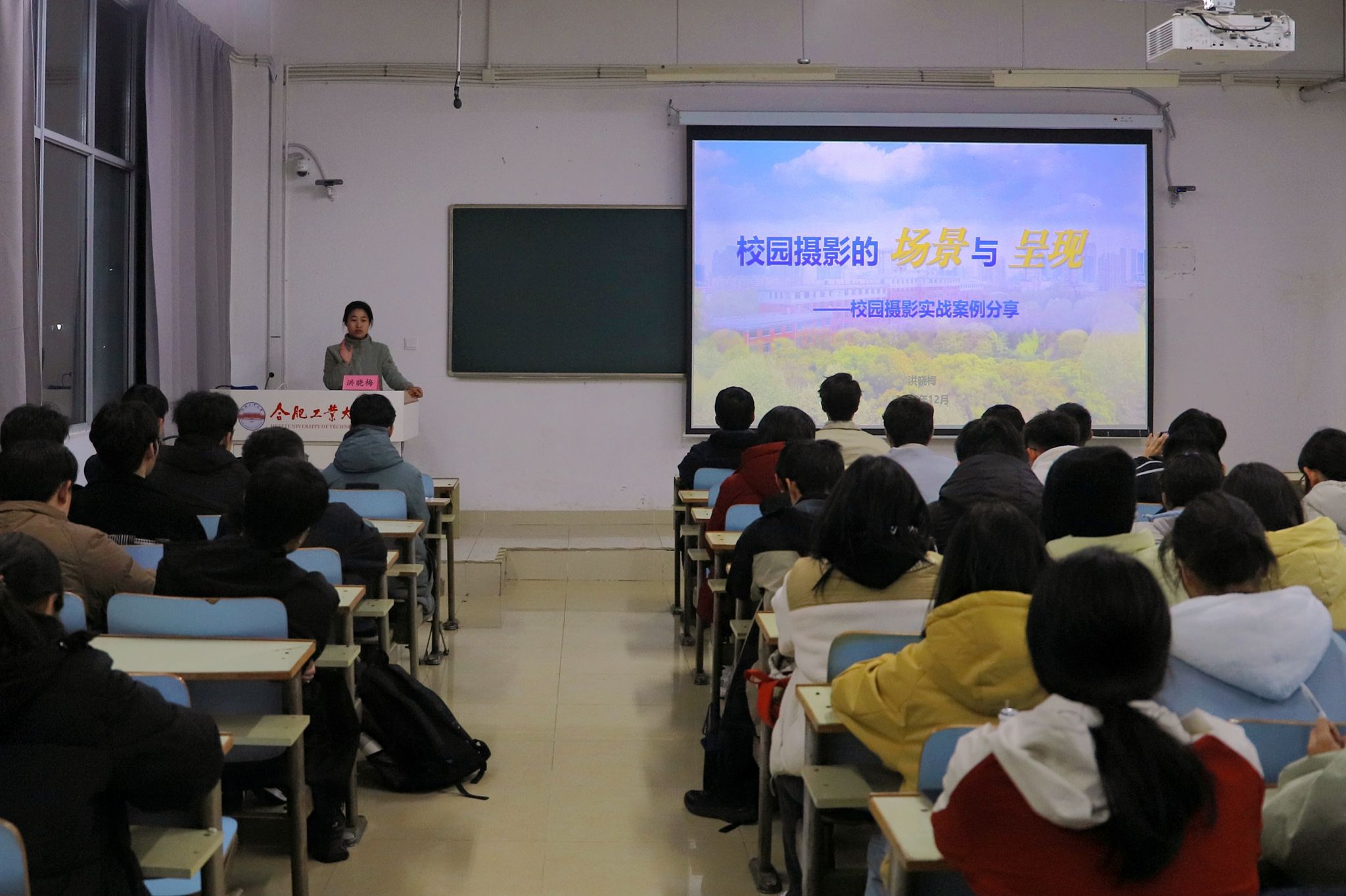 党委学生工作部(处)智慧学工科科长、明理苑大学生网络文化工作室指导教师洪晓梅以《校园摄影的“场景”与“呈现”》为题展开讲授,她对常用摄影设备分类及其特点进行综述,详细介绍了相片感光度、快门速度、光圈值等曝光基本要素,讲解了不同拍摄环境下的构图思路与后期影像处理方法,并结合实际工作案例,分享了开学典礼、国旗下的思政课、军训集中教育阶段成果展示等各类活动会议的影像采集与宣传报道全流程。