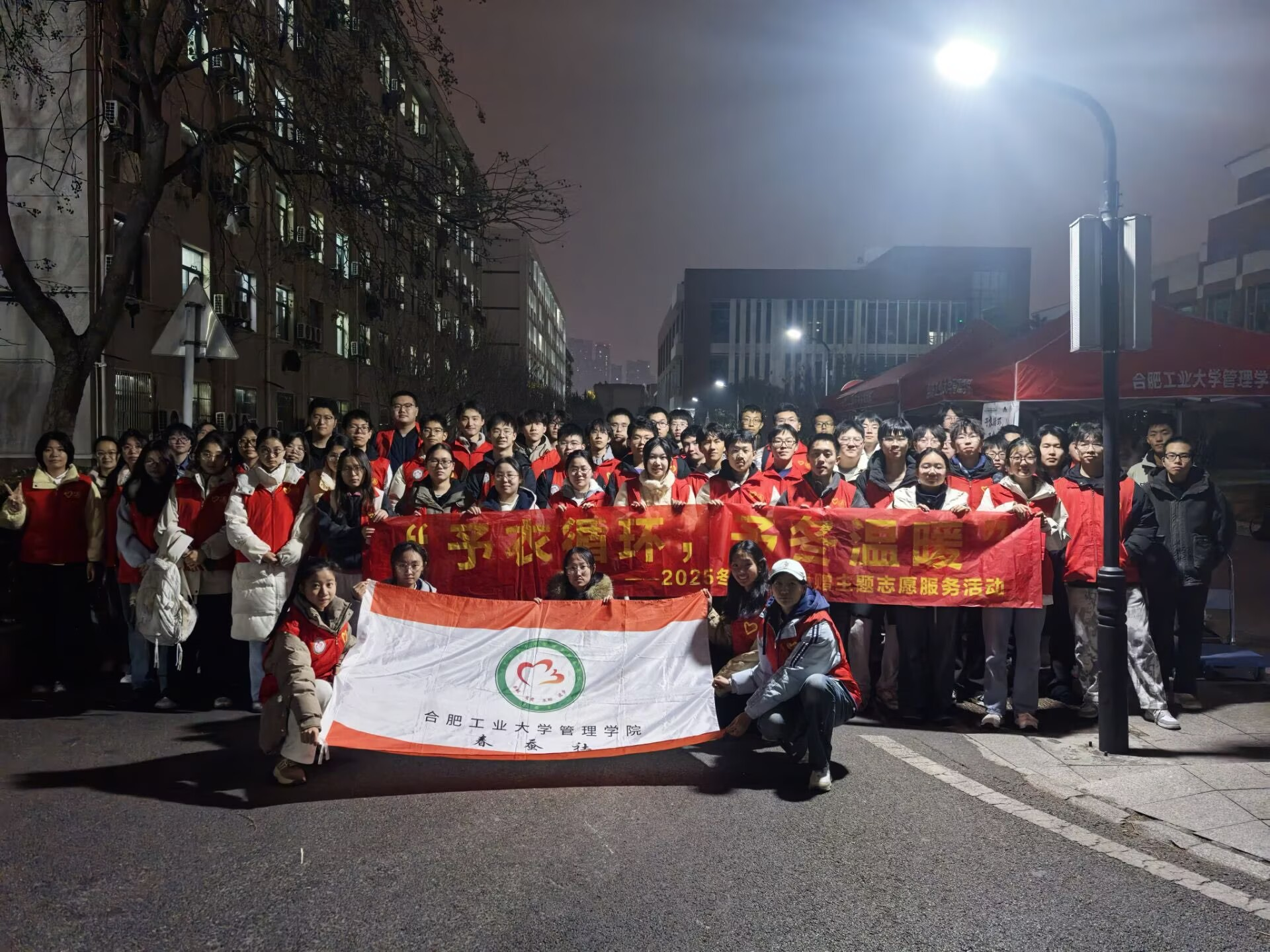 活动开展前,阳光社与春蚕社两支志愿团队分组分批深入校内宿舍楼,开展旧衣捐赠的宣传动员与物资收集工作。志愿者耐心讲解活动目的,呼吁同学们捐赠闲置旧衣,同学们积极响应,纷纷献出棉衣、外套等过冬衣物。夜幕降临,志愿者们依旧热情不减,对驻足询问的同学细致解答,传递善意与温暖。同时,志愿者们承担物资搬运重任,将爱心衣物仔细收纳、清点并运送至指定存放点,全程高效有序。后续,收集的衣物将经分拣、消毒后,送往有需要的地区和群体,让每份爱心都落到实处。