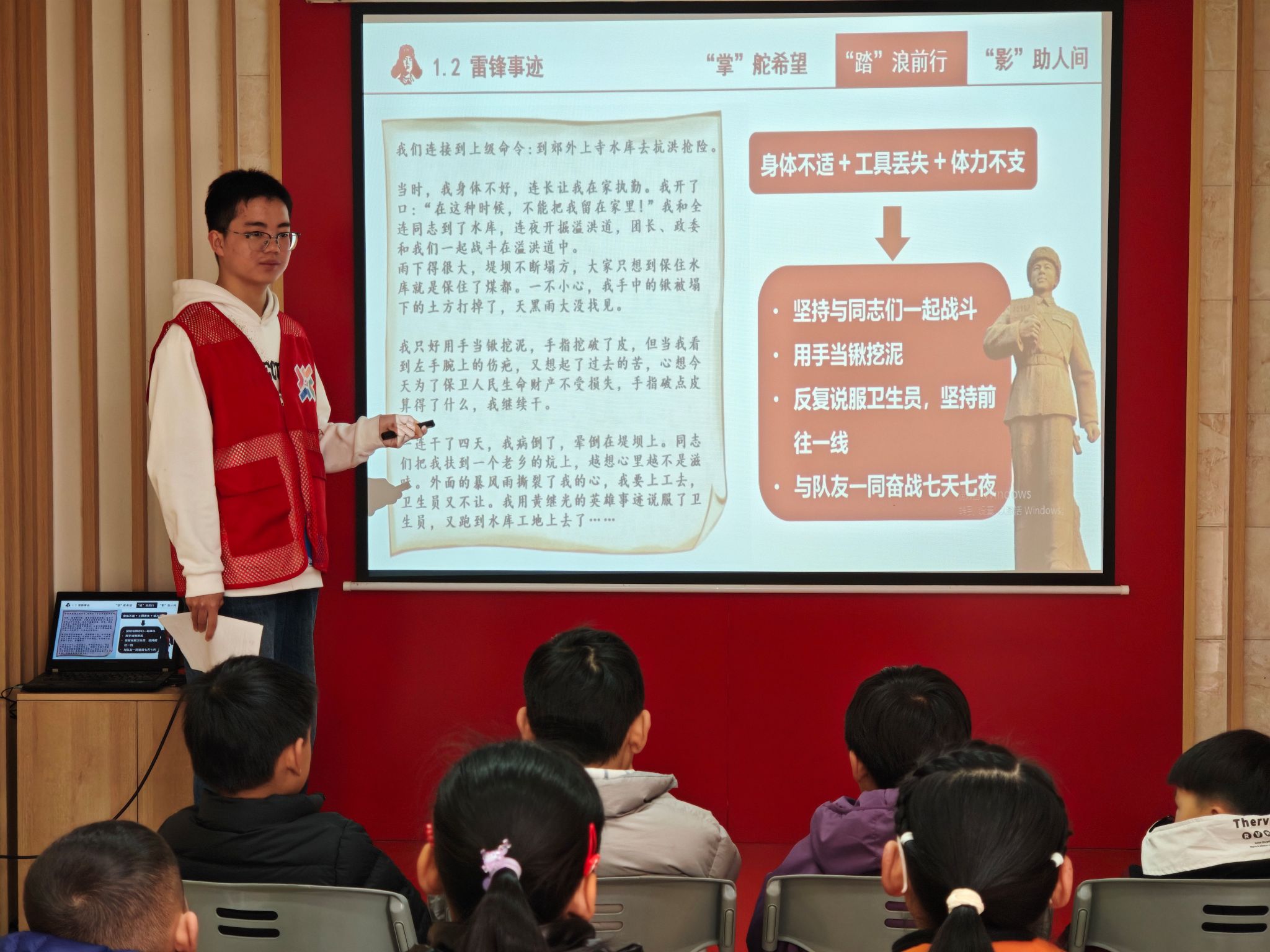 在课程中,主讲人通过播放影片、现场朗诵、提问互动与齐唱红歌相结合的丰富形式,充分调动起孩子们的参与热情,将雷锋精神的传承与青少年的成长成才紧密连接,让孩子们在沉浸式的学习体验中,深刻理解雷锋精神与时代发展、个人成长的深刻关联。