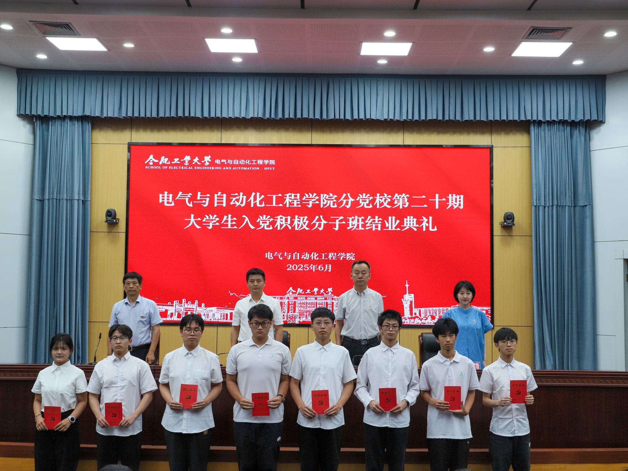 典礼在庄严的国歌中拉开序幕。施大顺宣读了《关于批准学院分党校第二十期大学生积极分子培训班学员结业的通知》。张栋宣读了《关于表彰学院分党校第二十期大学生积极分子培训班“优秀学员”和“优秀班主任”的决定》,随后,与会领导老师为管立涛等17名优秀学员进行颁奖。接着,电气工程及其自动化创新实验23-1班耿濮勇同学代表全体结业学员发言,他分享了党校培训中的收获,并代表全体学员承诺,将继续努力,以实际行动书写青春最亮丽的底色,为中国式现代化挺膺担当。