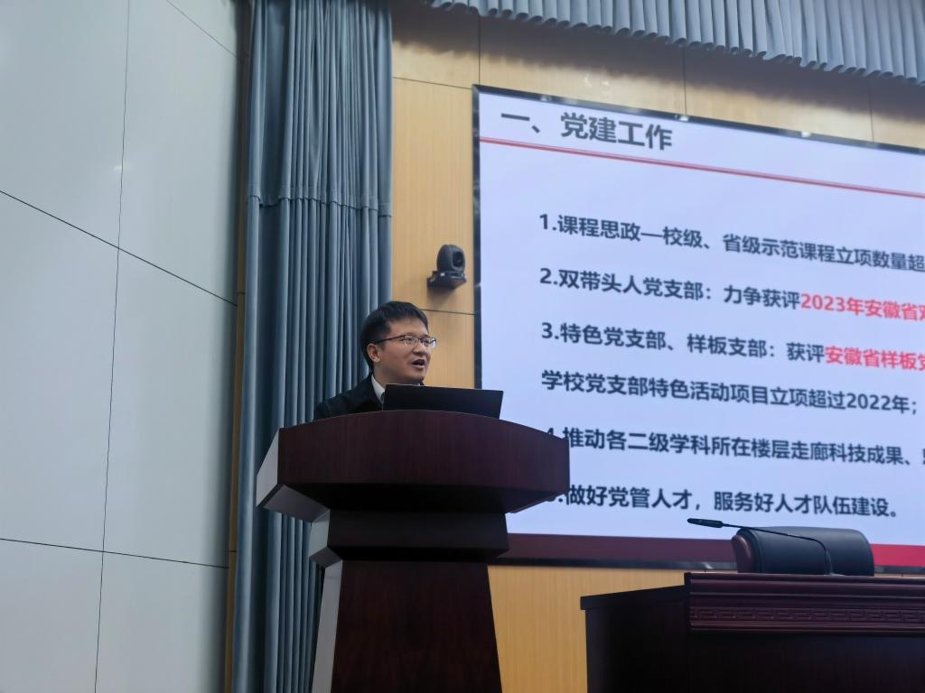 院长向念文从党建工作、教学工作、科研工作、人才工作、学生工作、行政工作等七个方面,对学院整体工作要点和建设思路进行了详细的阐述汇报。通过找短板,查弱项,多维度指标对比,厘清了学院工作思路,明确了学院本年度重点工作任务。他强调,新的一年,学院要以党的二十大精神为指引,以提高人才培养质量为出发点和落脚点,围绕基地建设、科研团队建设,推动学科发展与人才培养。学院教师应努力提升教育教学能力,将个人规划融入到学院发展规划中,凝聚共识,为推动学院高质量发展而努力奋斗。