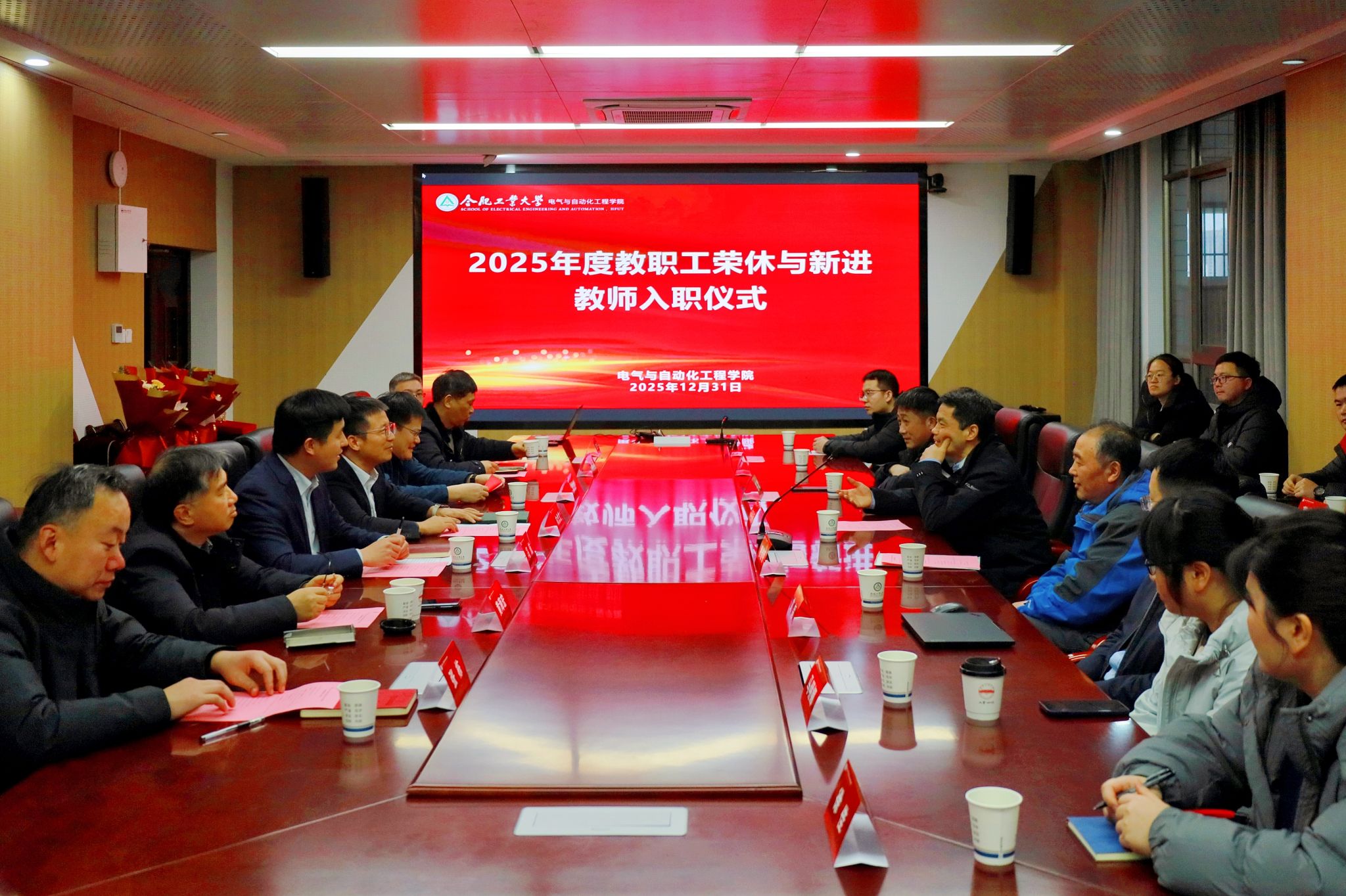 12月31日下午,电气与自动化工程学院在逸夫楼1009会议室举行2025年度教职工荣休暨新教职工入职仪式。学院领导班子、各系(中心)负责人、2025年退休职工及新入职青年教师出席活动。