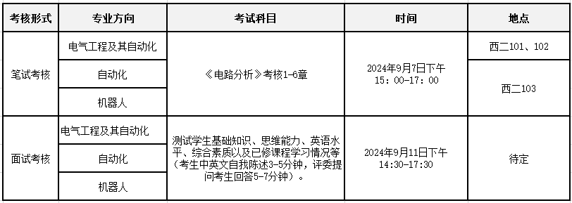 根据《合肥工业大学普通全日制本科生转专业管理暂行办法》合工大政发〔2024〕70号),及学校发布的《关于开展2024年合肥校区本科生全校范围内转专业工作的通知》,申请转入电气工程及其自动化、自动化、机器人专业,经学院初审通过的学生,请在教学管理系统中查看笔试时间和地点,并注意以下几点事项:
