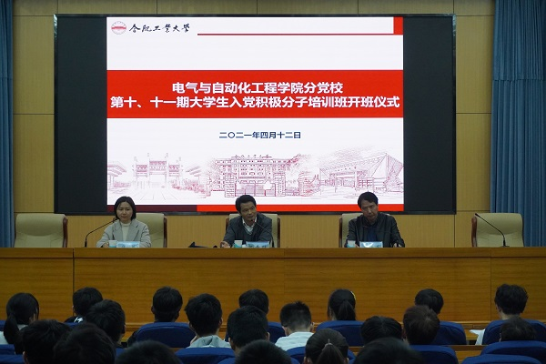 在建党一百周年来临之际,按照校党委统一部署和院党委总体规划,2021月4月12日晚,电气与自动化工程学院分党校第十、十一期大学生入党积极分子班开班典礼在学术会议中心报告厅举行。院党委书记、分党校校长何岳颀和党委副书记兼纪委书记、分党校副校长郑洁,学院副处级组织员孟祥发出席了典礼。