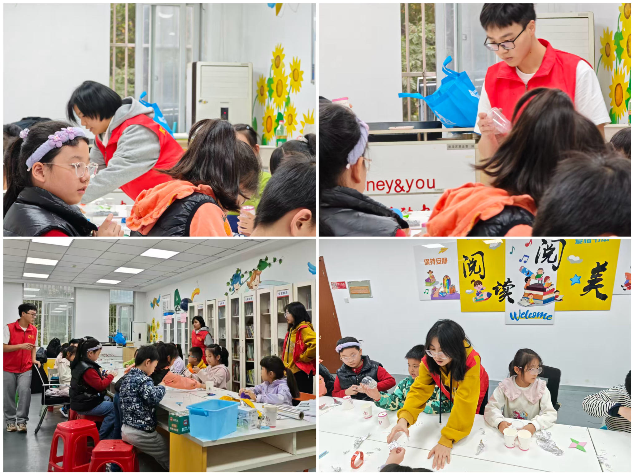 趣味解码科学,实操培育思维。在方桥社区,“不再燃烧的蜡烛”孩子们见证火苗熄灭、水位上升的奇妙现象,志愿者以“捏扁矿泉水瓶”的通俗类比,生动解读氧气消耗与气压变化原理;“声震小风车”让孩子们通过发声驱动风车旋转,直观理解能量转换奥秘;“彩虹瓶子”借助盐水密度差异打造彩色漩涡,让抽象概念鲜活可触。“小小潜水员”“鸡蛋浮沉的奥秘”“瓶子赛跑”等实验,分别从浮力、密度、摩擦力等角度,引导孩子们在亲手操作中观察现象、探寻成因,逐步培养科学思维。