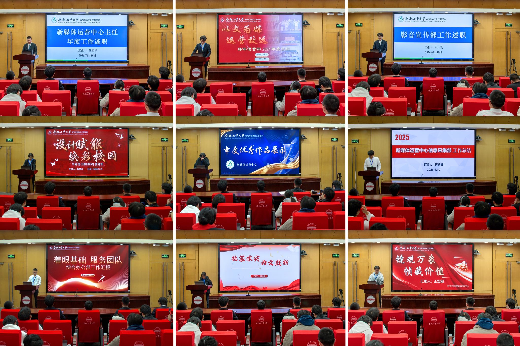 各述其职,回首总结。与会人员现场观看了年度总结视频《电气媒体人的2025》,新媒体运营中心主任翟相博针对任职以来所开展的工作进行梳理汇报,综合办公部、影音宣传部、媒体运营部、信息采集部、平面设计部负责人与新进骨干围绕部门职责、履职情况、工作成绩与不足,依次进行了述职发言。